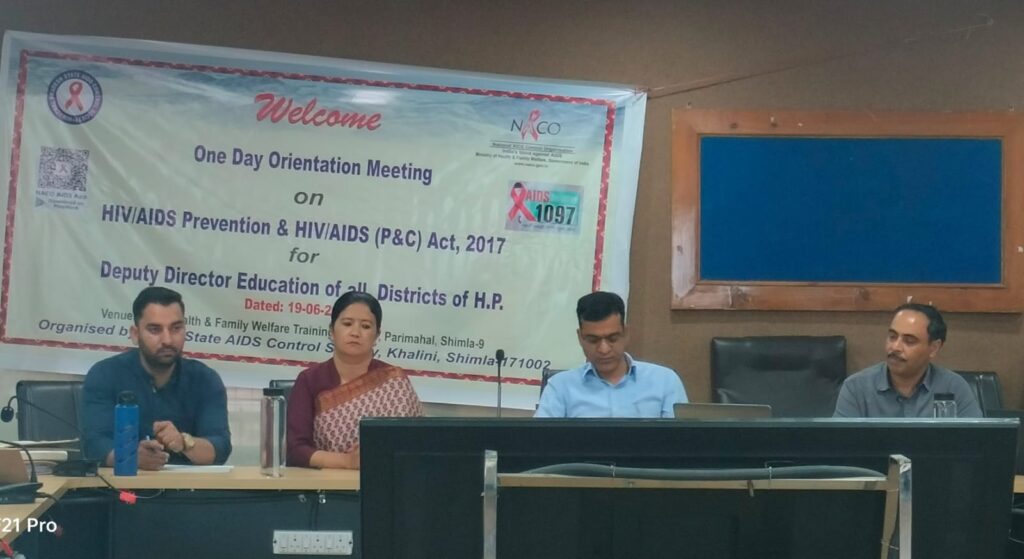 हिम न्यूज़ शिमला। हिमाचल प्रदेश राज्य एड्स नियंत्रण समिति द्वारा आज यहां शिक्षा विभाग के सभी उप-निदेशकों के लिए अभिविन्यास (ओरिएन्टेशन) बैठक का आयोजन किया गया। बैठक की अध्यक्षता करते हुए परियोजना निदेशक राजीव कुमार ने कहा कि बैठक का मुख्य उद्देश्य शिक्षा विभाग के माध्यम से प्रदेश के सभी स्कूलों के विद्यार्थियों को एचआईवी/एड्स के प्रति जागरूक करना है। उन्होंने कहा कि युवाओं और बच्चों को अगर एचआईवी के बारे में पूरी जानकारी होगी तो वह स्वस्थ और खुशहाल जीवन जी सकेंगे।