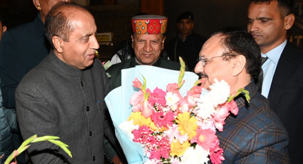 हिम न्यूज़ शिमला। भाजपा राष्ट्रीय अध्यक्ष जगत प्रकाश नड्डा के हिमाचल आगमन को प्रदेश भाजपा ने अत्यंत महत्वपूर्ण बताया है। नड्डा का विली पार्क पहुंचते ही उत्साहपूर्ण वातावरण में भाजपा प्रदेश अध्यक्ष डॉ. राजीव बिंदल, नेता प्रतिपक्ष जयराम ठाकुर, प्रदेश प्रभारी श्रीकांत शर्मा, सह प्रभारी संजय टंडन, महामंत्री संगठन सिद्धार्थन, भाजपा विधायकगण एवं प्रदेश पदाधिकारियों ने उनका जोरदार स्वागत किया।विधायकों ने पुष्पगुच्छ और गुलाब की कलियां भेंट कर राष्ट्रीय अध्यक्ष का अभिनंदन किया। नड्डा जी चंडीगढ़ से शिमला सड़क मार्ग से पहुंचे, जिसे कार्यकर्ताओं ने एक सरल, जनसंपर्क केंद्रित यात्रा के रूप में देखा।