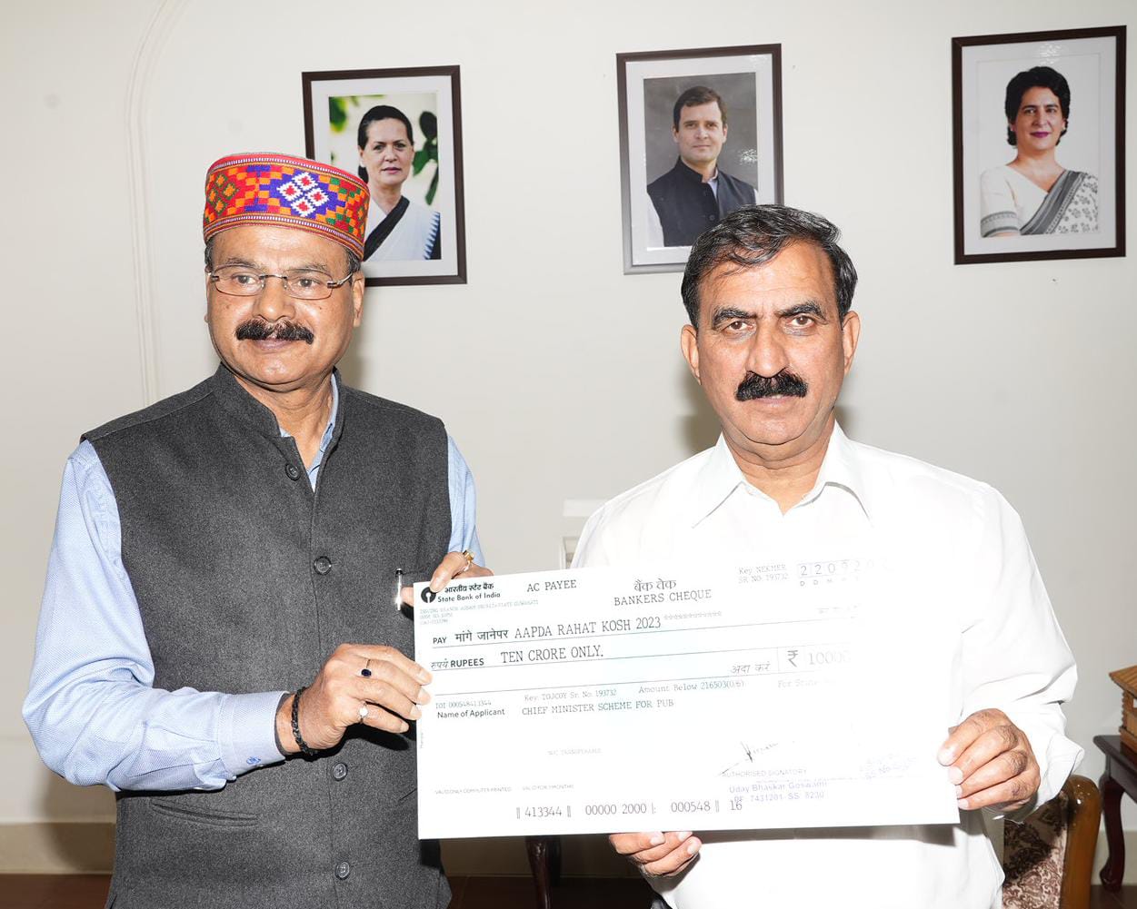 हिम न्यूज़,शिमला-हिमाचल प्रदेश मे भारी बारिश, बाढ़ एवं भूस्खलन से आई आपदा से निपटने के लिए प्रदेश सरकार द्वारा गठित आपदा राहत कोष-2023 में असम सरकार ने 10 करोड़ रूपये की सहायता राशि का अंशदान किया है। इस राशि का एक चेक आज यहां असम के वन मंत्री चन्द्र मोहन पटोवारी ने मुख्यमंत्री ठाकुर सुखविंदर सिंह सुक्खू को भेंट किया।