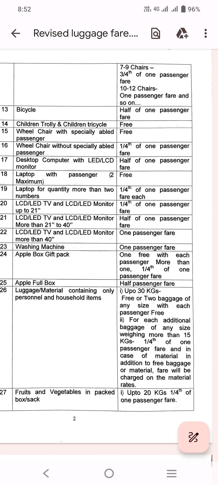 40 किलो का आधा टिकट और 80 किलो का पूरा टिकट बनता था। अब 30 किलो से अधिक सामान के लिए 15 किलो का एक चौथाई टिकट लेना होगा। पहले 25 किलो पर एक चौथाई टिकट लेना होता था। फुल बॉक्स के लिए आधा टिकट लगेगा। बिना यात्री हाफ बॉक्स के लिए आधा टिकट, फुल बॉक्स के लिए पूरा टिकट लगेगा। अब तक एक यात्री अपने साथ सेब का एक फुल बॉक्स मुफ्त ले जा सकता था। पेट्रोल, डीजल, केरोसिन, एसिड, गन पाउडर, गुटका, पान मसाला सहित 25 अन्य सामान ले जाने पर प्रतिबंध लगाया गया है। यात्री के साथ दो लैपटॉप मुफ्त और बिना यात्री के पूरे टिकट के पैसे देने होंगे।