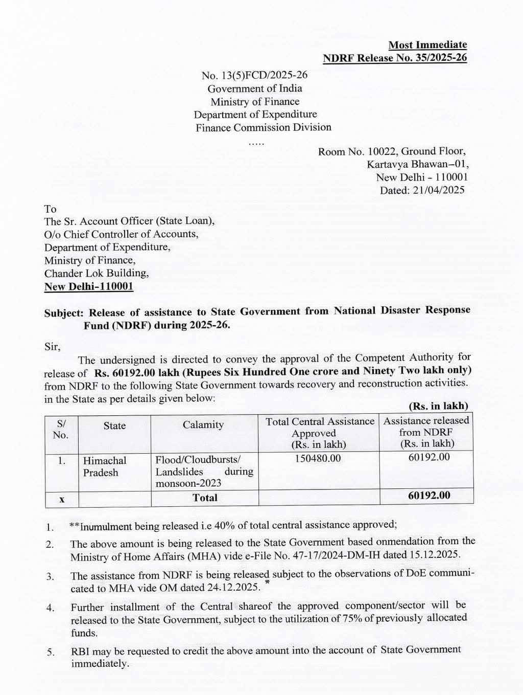 सांसद कश्यप ने कहा कि यह राहत राशि पोस्ट डिजास्टर नीड असेसमेंट (PDNA) के तहत नेशनल डिजास्टर रिस्पॉन्स फंड की रिकवरी एंड रीकंस्ट्रक्शन विंडो से जारी की गई है। कुल 601.92 करोड़ रुपये की यह दूसरी किश्त है। इससे पहले केंद्र सरकार हिमाचल को 400 करोड़ रुपये से अधिक की पहली किश्त जारी कर चुकी है। वर्ष 2023 की आपदा के बाद केंद्रीय टीम द्वारा PDNA के तहत हिमाचल में 9300 करोड़ रुपये से अधिक के नुकसान का आकलन किया गया था, जिसके आधार पर केंद्र सरकार ने कुल 1504.80 करोड़ रुपये की सहायता को मंजूरी दी थी।