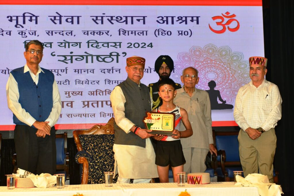 इससे पूर्व, देव भूमि सेवा संस्थान आश्रम के अध्यक्ष लेख राज राणा ने राज्यपाल का स्वागत किया। उन्होंने कहा कि संस्थान अपने अन्य प्रकल्पों के अतिरिक्त योग के जनजागरण का कार्य कर रहा है। संस्थान की प्रदेश भर में 70 संस्कार शालाएं कार्यरत हैं। इस अवसर पर शिमला, तारादेवी के शगीन गांव के 10 वर्षीय सक्षम ठाकुर ने योगाभ्यास का प्रदर्शन कर सभी को प्रभावित किया। राज्यपाल ने सक्षम की योग साधना की सराहना करते हुए उन्हें सम्मानित भी किया। साईं एटरनल फाउंडेशन के अध्यक्ष राजकुमार वर्मा इस अवसर पर विशिष्ट अतिथि के रूप में उपस्थित थे। पूर्व मंत्री सुरेश भारद्वाज तथा अन्य गणमान्य व्यक्ति भी इस अवसर पर उपस्थित रहे।